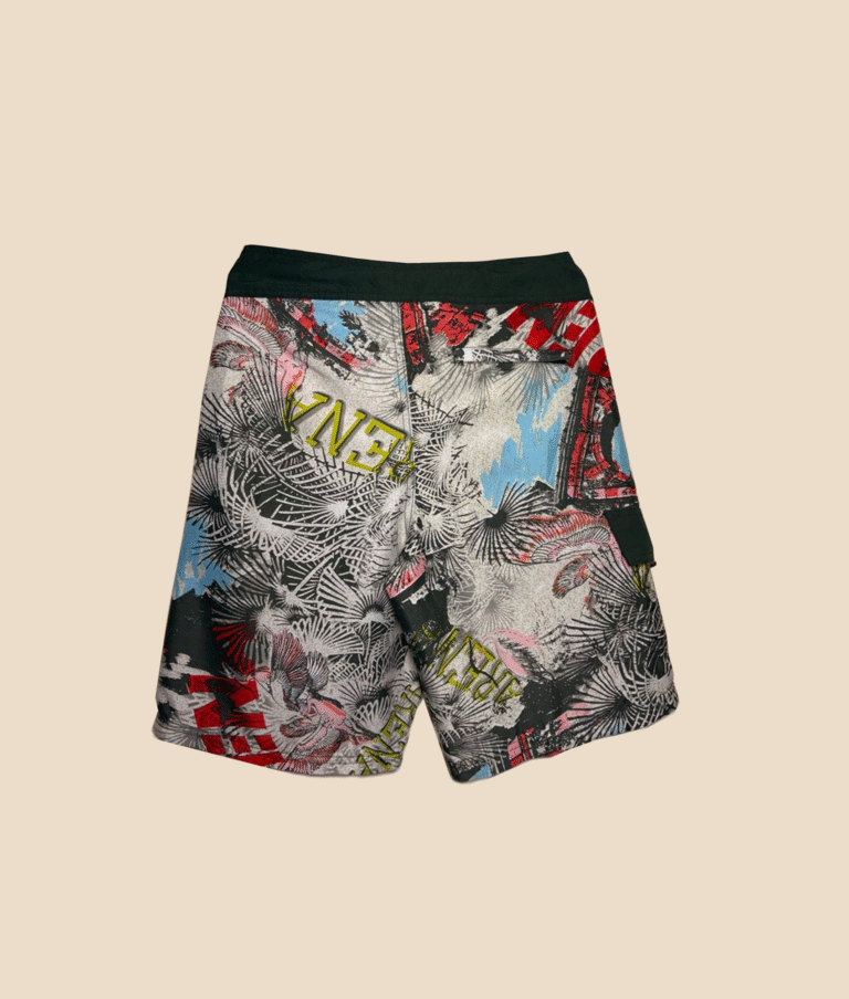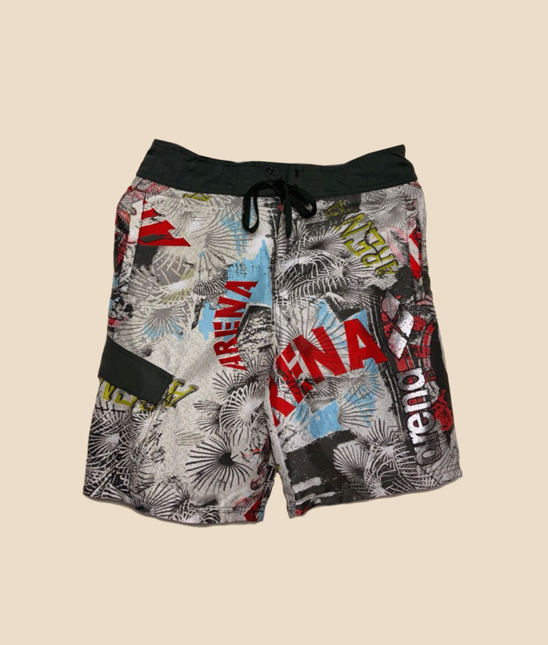 Stylish and functional board shorts featuring a tropical palm print with bold lettering in shades of red, yellow, and green.
