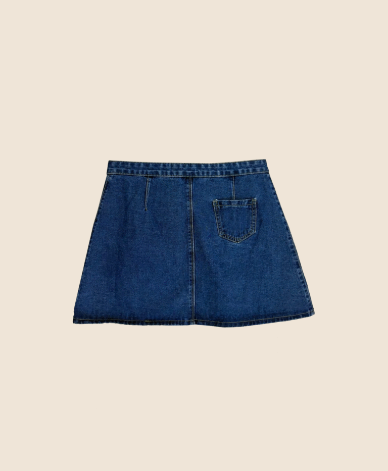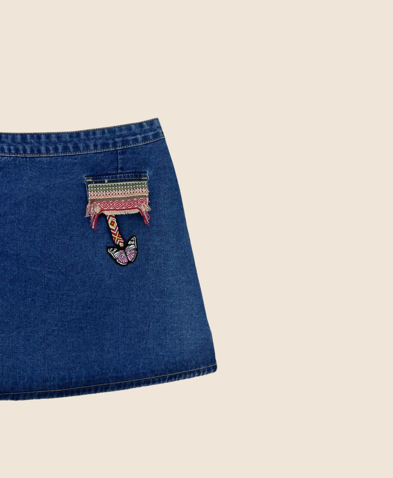 A creative twist on classic denim, this asymmetrical wrap skirt features colorful embroidered and patchwork details that give it a bohemian flair. The side button closure adds character and versatility, while the mid-wash denim base keeps it grounded. Pair it with a simple white top to let the artistry stand out.