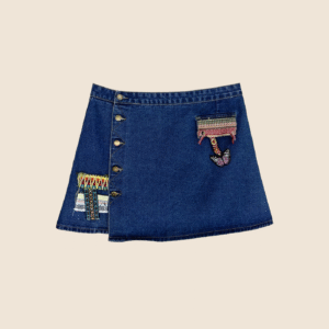 A creative twist on classic denim, this asymmetrical wrap skirt features colorful embroidered and patchwork details that give it a bohemian flair. The side button closure adds character and versatility, while the mid-wash denim base keeps it grounded. Pair it with a simple white top to let the artistry stand out.