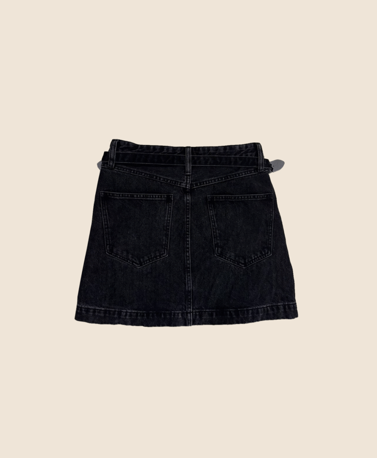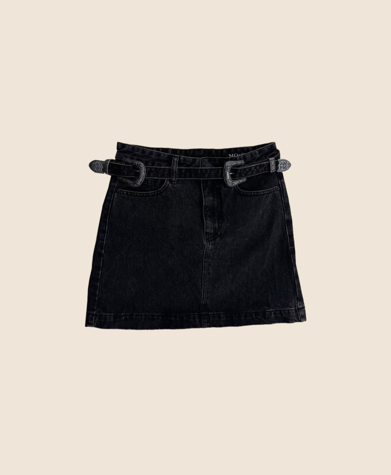 This edgy dark gray denim mini skirt comes with a statement double belt detail at the waist, adding a modern and slightly rebellious touch.