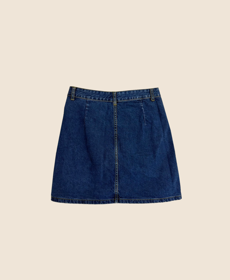 A timeless A-line denim skirt featuring a front button closure and two spacious patch pockets. Crafted from medium-wash blue denim, it offers a structured yet comfortable fit. Perfect for casual outings, this piece pairs effortlessly with tucked-in tees or lightweight blouses for a vintage-inspired look.