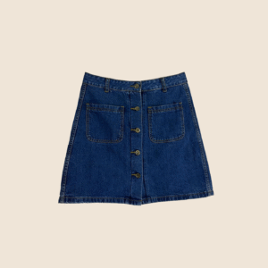 A timeless A-line denim skirt featuring a front button closure and two spacious patch pockets. Crafted from medium-wash blue denim, it offers a structured yet comfortable fit. Perfect for casual outings, this piece pairs effortlessly with tucked-in tees or lightweight blouses for a vintage-inspired look.