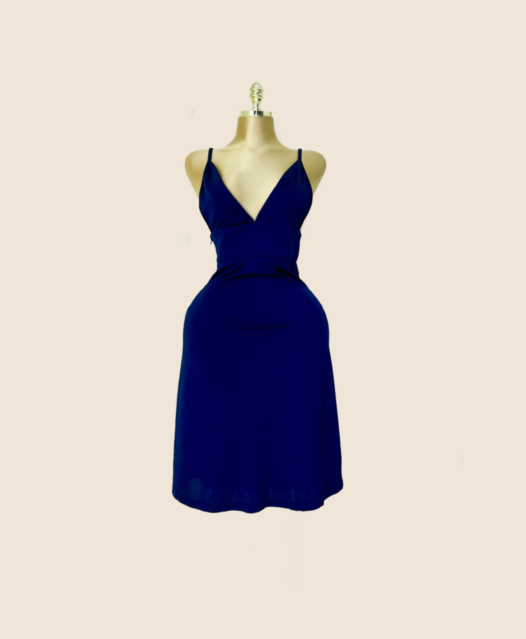 A sleek and timeless navy blue dress with delicate spaghetti straps and a flattering V-neckline.